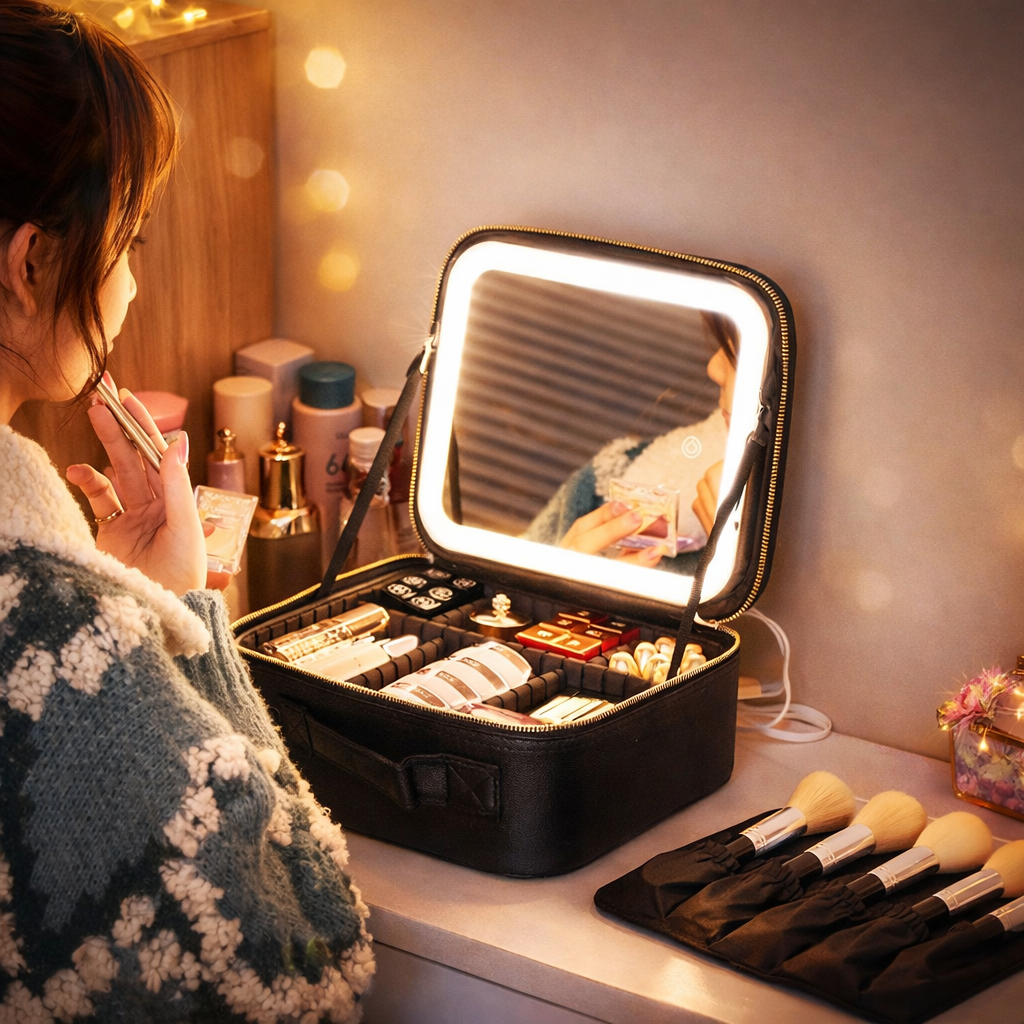 Cosmetic Bag with LED Light & Full-Screen Mirror